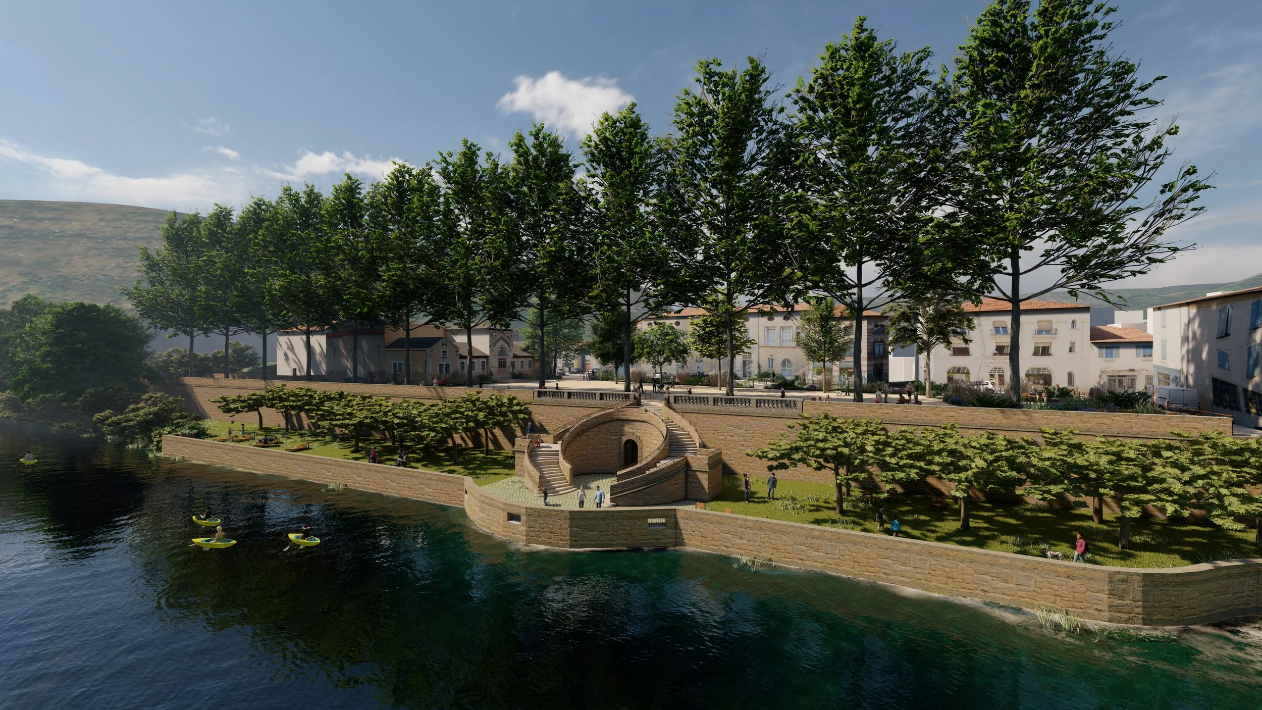 Le réaménagement de cette place a été modélisé en 3D photoréaliste en collaboration avec l'Agence Casals, pour la commune de Saint Antonin Noble Val. Des perspectives, une vidéo animée, des vues orthographiques, et des photomontages ont été réalisés pour faciliter la communication et la projection du projet dans son environnement.